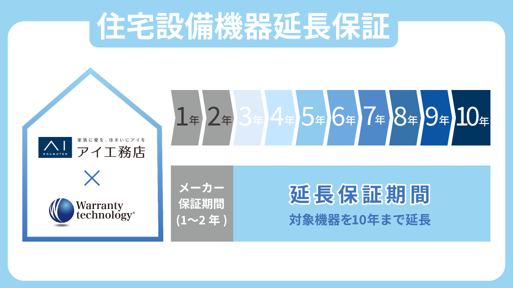 住宅設備機器は、設置から5年以降に故障する確率が急激に上昇するにもかかわらず、メーカー保証期間は1年程度であるのが現状です。この度、ワランティテクノロジーが延長保証サービスを提供することにより、契約会社が販売する住宅に設置されている対象機器は最長10年間保証されます。ワランティテクノロジーの延長保証サービスの提供は、アイ工務店が契約会社への包括的なサポートを強化したいという思いから、実現に至りました。