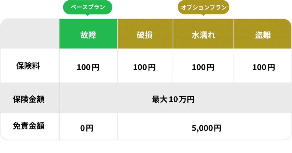 「故障」に対する損害を補償するベースプランは、月額100円。さらに、各100円のオプションでお客様のニーズに合わせて補償内容を自由にカスタマイズ可能です。フルオプションの保険料でも月額400円で、年間最大10万円(通算)までの修理代金が補償されます。