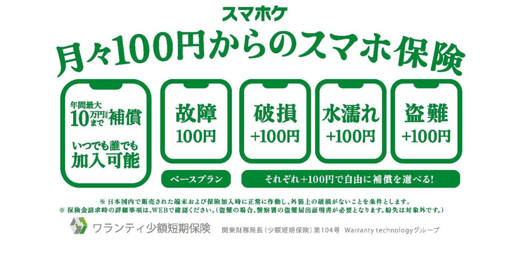 「スマホケ」は、いつでも加入できるスマートフォン向けの保険商品です。月々100円の故障をベースプランとして、破損・水濡れ・盗難については各100円という手頃な保険料で自由に選択・追加してカスタマイズすることが可能です。年間通算10万円までの修理代金が補償され、お客様の大切なスマートフォンの“まさか”に備えられます。