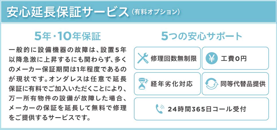 購入時に安心延長保証サービスを付帯いただくことにより、設置日より最長10年間、修理回数無制限で無償修理をご利用いただけます。