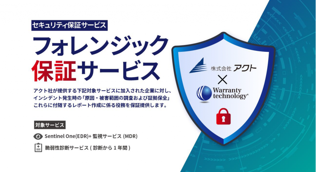 当社は、この度、株式会社アクト(以下、アクト社)と提携し、独自のサイバーセキュリティ保証を提供いたします。万が一の時に発生する原因・被害範囲の調査および証拠保全、これらに付随するレポート作成に関わる役務を保証提供します。
