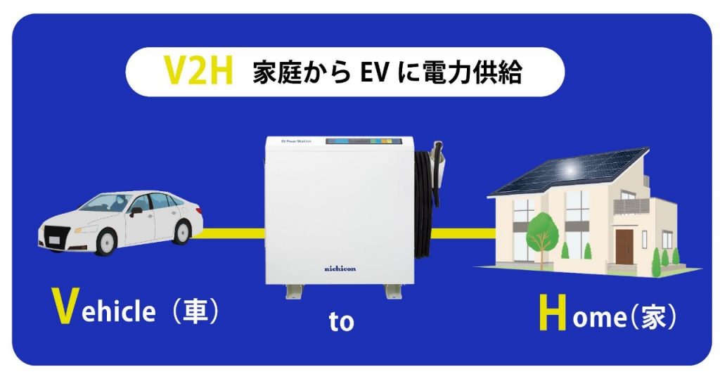 「V2H」とは、電気自動車(以下EV車)に充電されている電気を家庭に給電するシステムです。V2Hシステムを導入することで、EV車に搭載されている大容量バッテリーに蓄えた電気をご家庭で使用することが可能になり、災害などでの停電時にはバックアップ電源として電気を使用出来るようになります。また、通常時はEV車への充電器として使用することが可能で、太陽光で発電した電気をEV車へ充電することも行えるようになります。移動手段として使用していたEV車を暮らしの電源として有効活用することが可能になります。