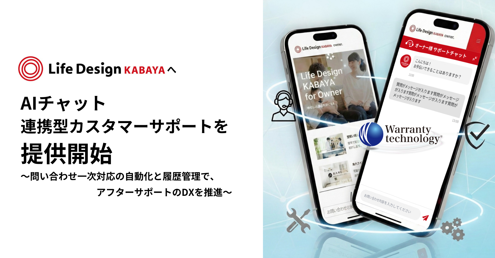 延長保証サービスの構築・運営を行う株式会社Warranty technology(本社:東京都千代田区、代表取締役CEO:宮原 年明、以下「ワランティテクノロジー」)は、ライフデザイン・カバヤ株式会社(以下「ライフデザイン・カバヤ社」)向けに、AIチャットと顧客管理システム(CRM/WOS)を連携した新たなアフターサポートソリューションの提供を開始したことをお知らせいたします。